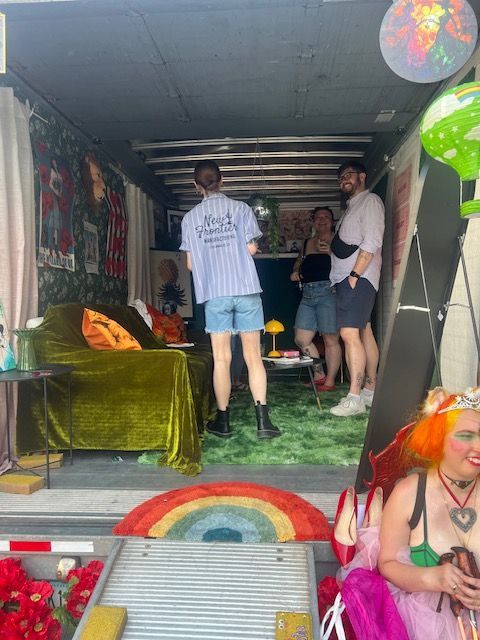 Our Pride event had a U-Haul decked out like an apartment for all people in the community to come hang, talk, eat, find new friends, play yard games, check out books and content and stay for our concert!
